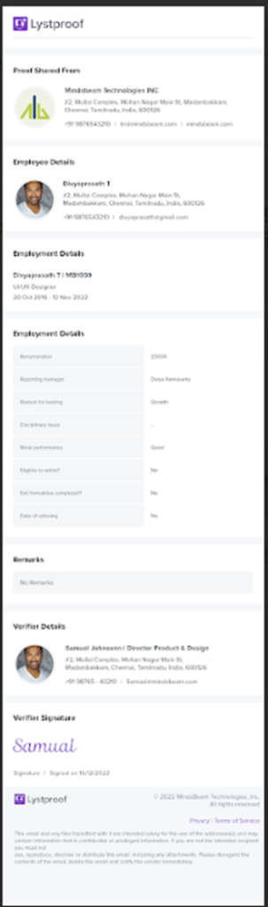 Lystproof’s HR document verification tool helps HR managers to keep tamper-proof employment records. It expedites the exit process and gives quick responses for background verification.